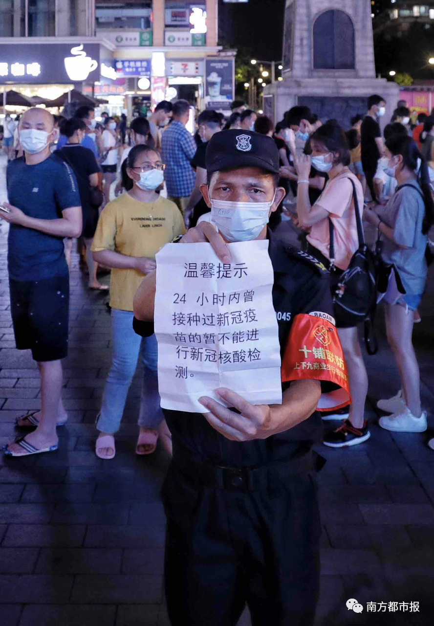 5月26日晚,荔湾上下九广场核酸检测点,一位安保人员拿着“24小时内接种过新冠疫苗暂不能进行新冠核酸检测”字样的纸张,给每位前来做核酸的居民温馨提示。南都记者 黎湛均 摄