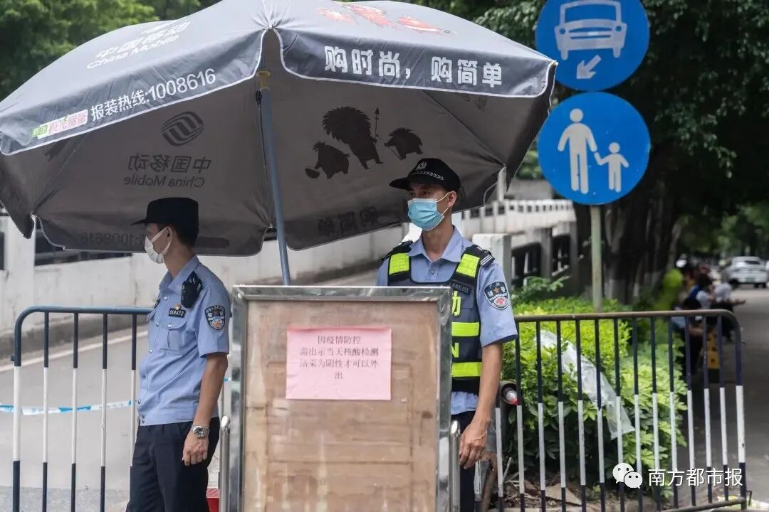5月29日,广州番禺区丽江花园渔人码头核酸采样点处,辅警正在现场维持秩序。南都记者 钟锐钧 摄