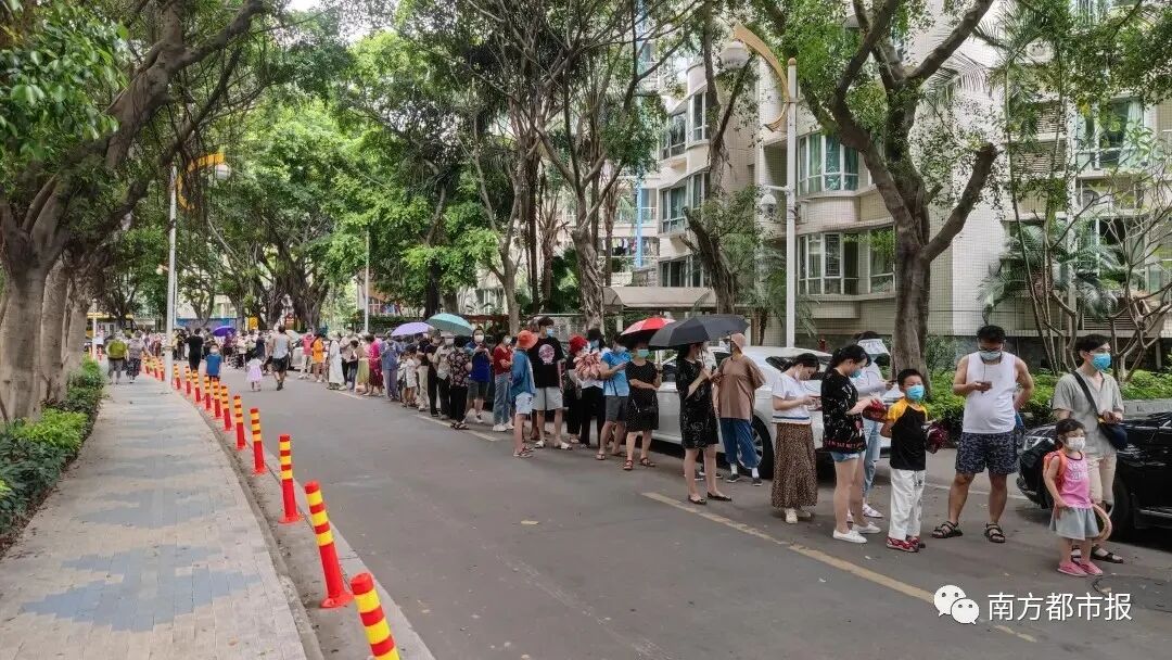 5月29日,在广州市番禺南浦岛海龙湾核酸采样点前,排起了长长的队伍。南都记者 谭伟山 摄