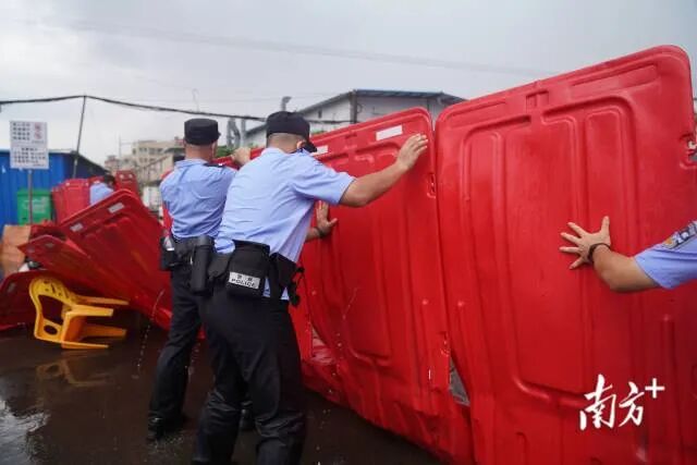 5月29日下午,广州市荔湾区招村暴雨过后,执勤警察将吹倒的护栏扶起。图据南方+