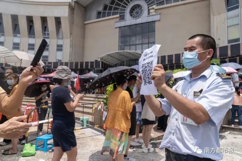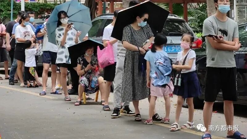 5月29日,一会是酷暑,一会突降暴雨,番禺南浦岛桔树街的市民仍坚持有序排队,等待核酸检测。摄影 超雄