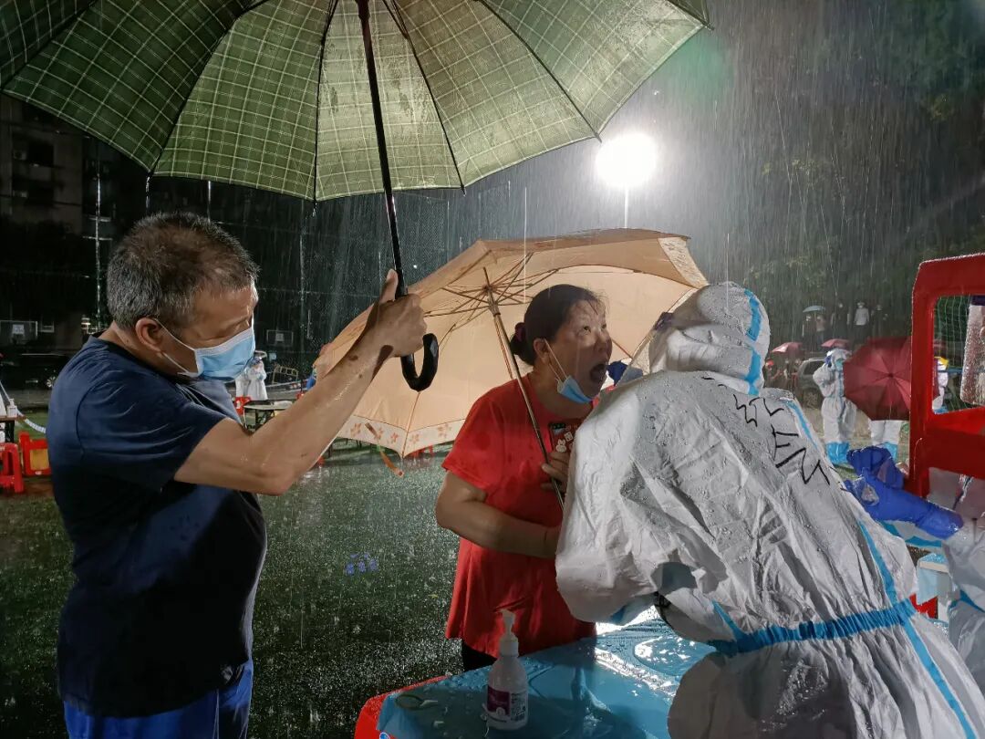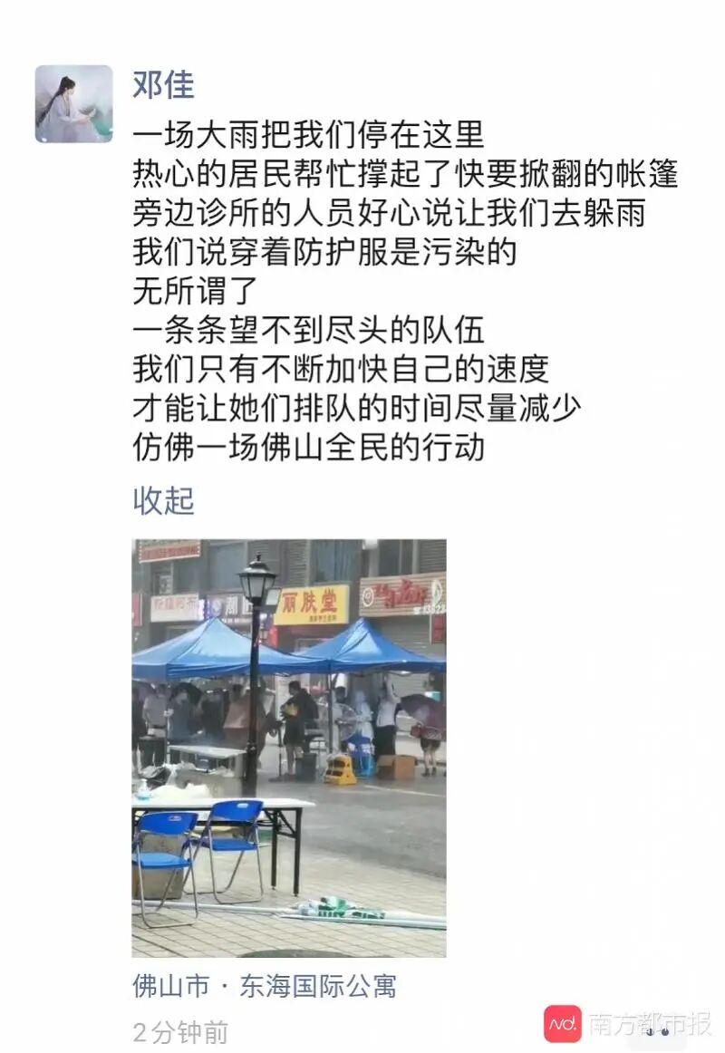 核酸采集工作第一天,龙舟水带来了倾盆大雨,邓佳发的朋友圈。