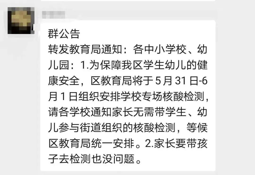 南都记者从越秀区教育局了解到,区内中小学学生、幼儿园幼儿可免于到社区排队,区教育局将于5月31日-6月1日组织安排学校专场核酸检测,请各学校通知家长无需带学生、幼儿参与街道组织的核酸检测,等候区教育局统一安排。若家长要带孩子去检测也可。
