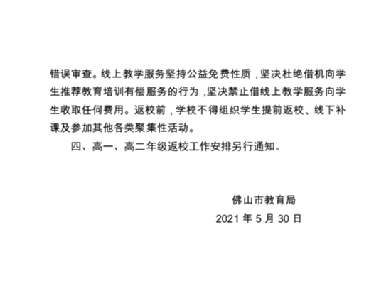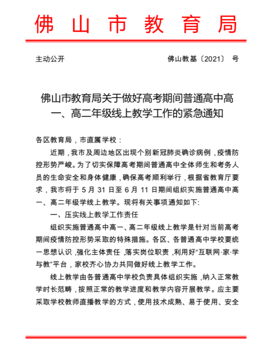 5月30日,广东佛山市教育局发布《关于做好高考期间普通高中高一、高二年级线上教学工作的紧急通知》(下称《通知》),为了切实保障高考期间普通高中全体师生和考务人员的生命安全和身体健康,确保高考顺利举行,根据省教育厅要求,佛山市将于5月31日至6月11日期间组织实施普通高中高一、高二年级学线上教学。返校工作安排另行通知。