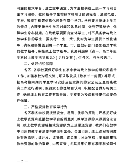 市教育局将编制《高一、高二年级学科线上教学指导意见》(另行发布),供各区、各学校选用。