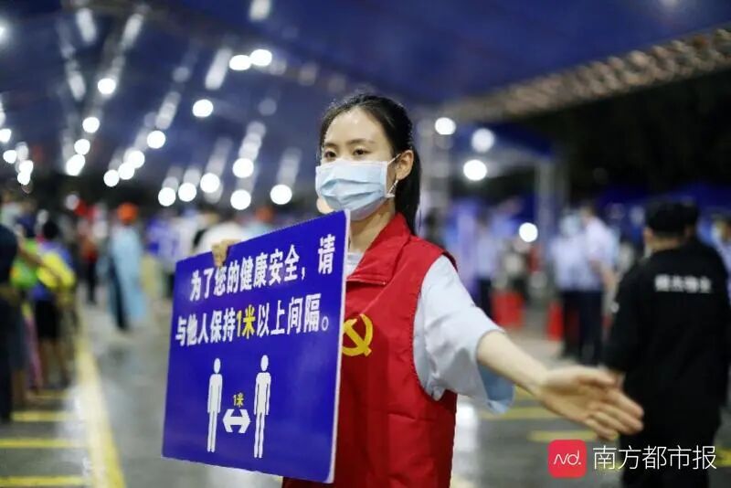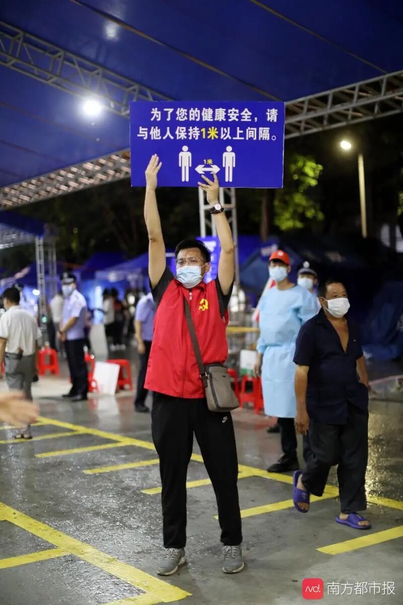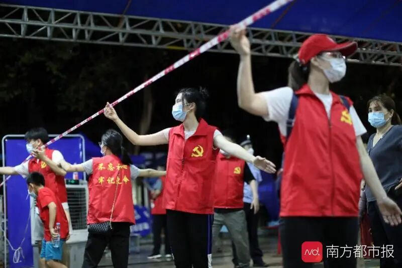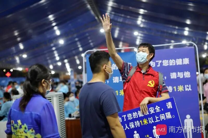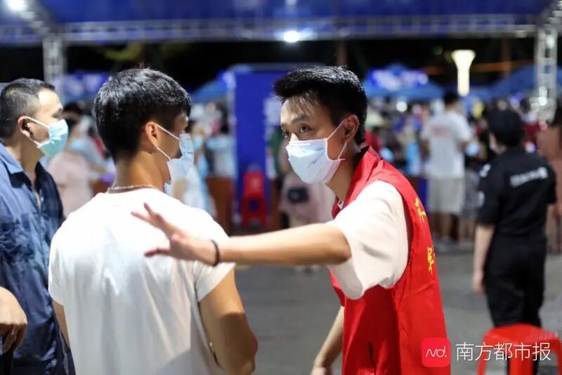 5月29日晚上8时,禅城岭南明珠体育馆,志愿者在核酸检测现场助力维持秩序。