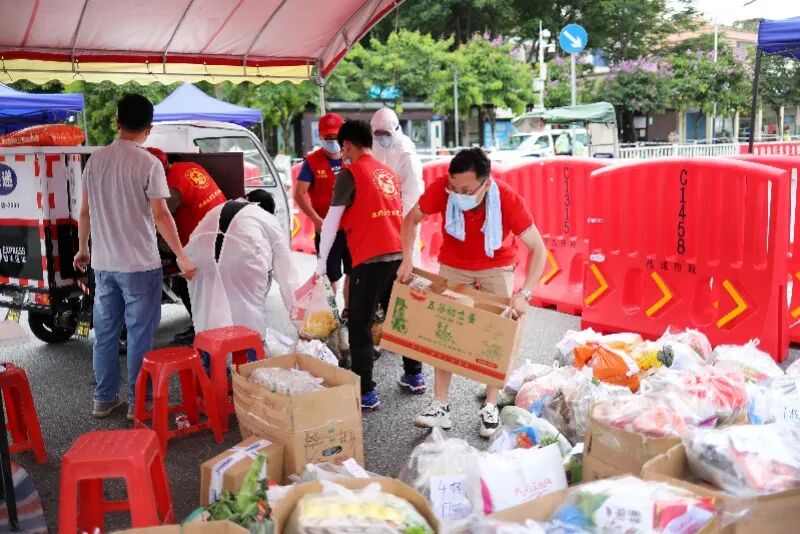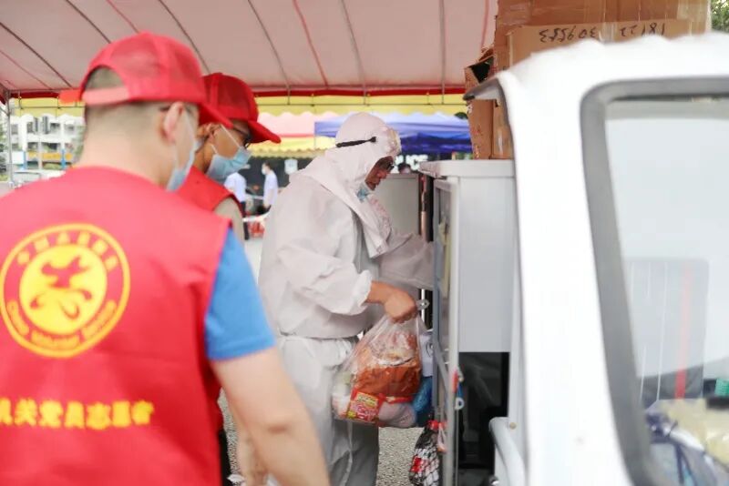 下午5点,各家各户准备晚餐的时候到了,小三轮不断往返于封闭小区与志愿服务点。守在服务点的志愿者们也忙了起来。每当小三轮开回志愿服务点,来自南海区委组织部的党员志愿者殷伟文就带头干起了搬运的活。