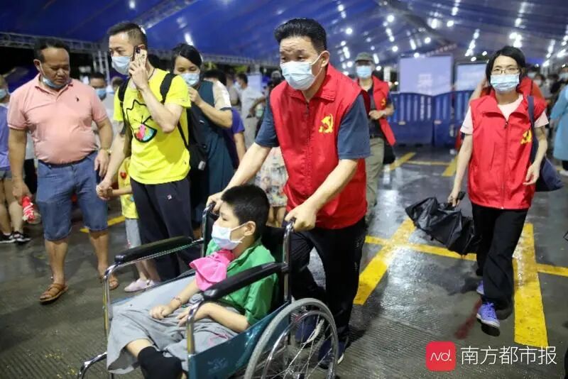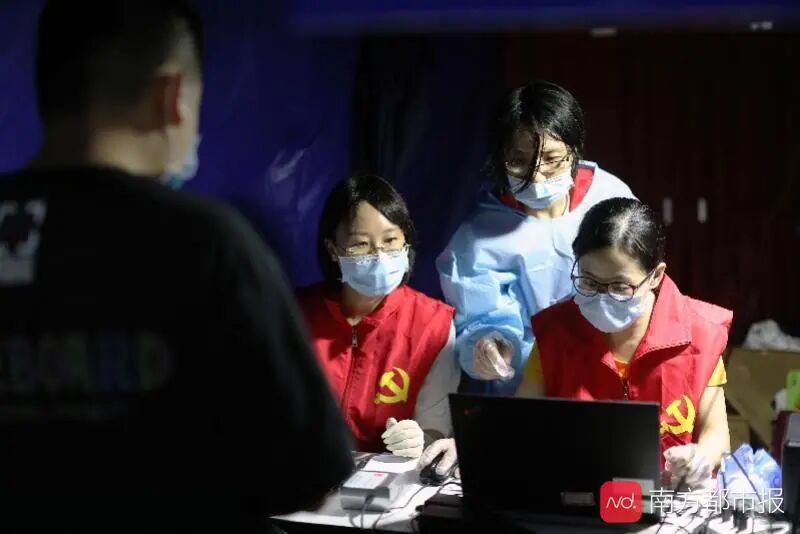 5月29日晚上8时,禅城岭南明珠体育馆,党员志愿者在登记区帐篷里仔细核对市民身份信息。