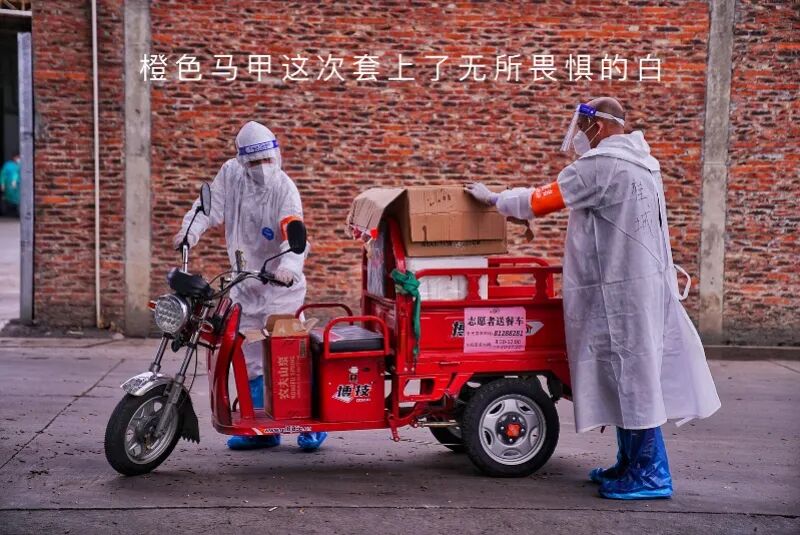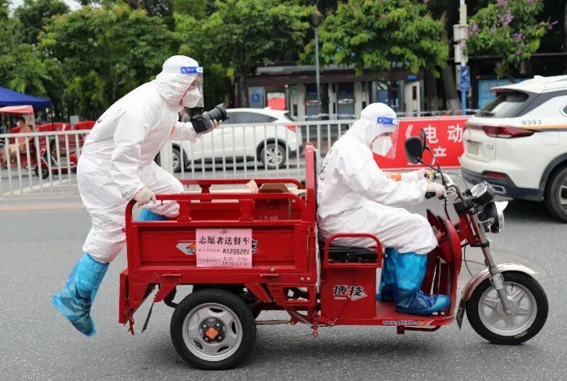 志愿者姚锦祥是在网上看到征集志愿者信息的,打过疫苗、身强体壮的他马上就报了名。30日一早,他骑着小电动就直接到了志愿服务现场,做好了个人防护以后,直接上岗冲在了一线。身上的橙色志愿者服换上成了白色的防护服,他开着一辆红色的三轮车,装着配餐公司送来的午餐就往封闭小区开去,给需要的居民送饭。