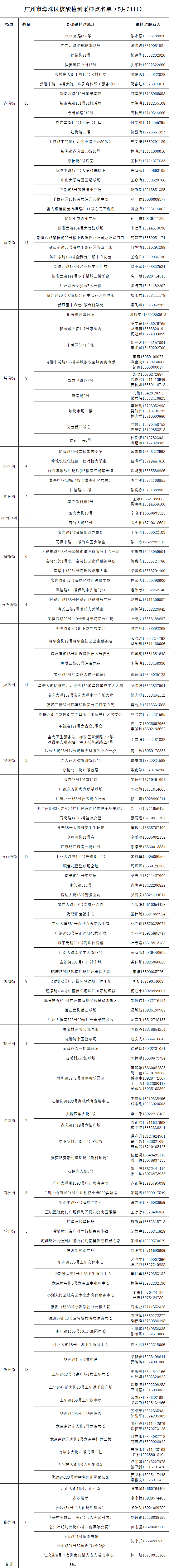 根据30号各采样点现场情况及采样进度,将新增一批核酸采样点,现公布5月31日(星期一)海珠区设立的核酸采样点。