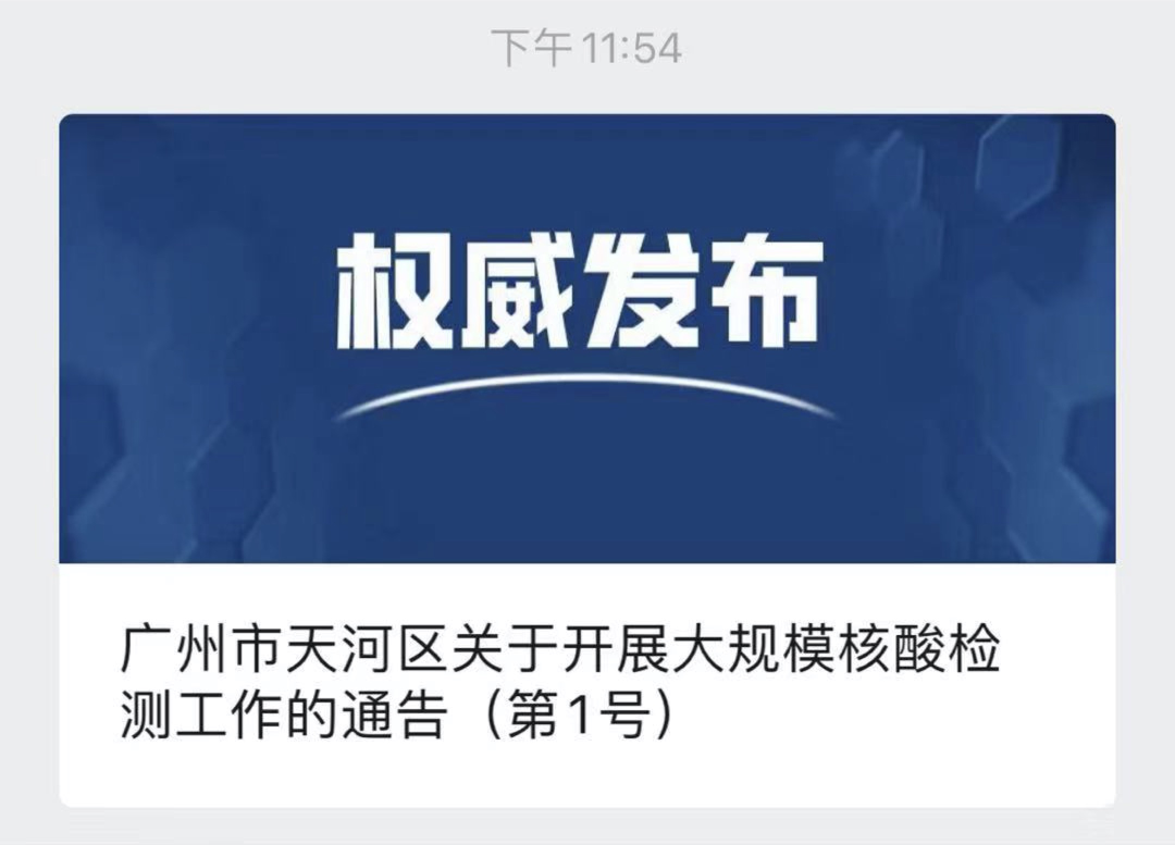 广州市天河区新型冠状病毒肺炎疫情防控指挥部5月30日发布《广州市天河区关于开展大规模核酸检测工作的通告(第1号)》