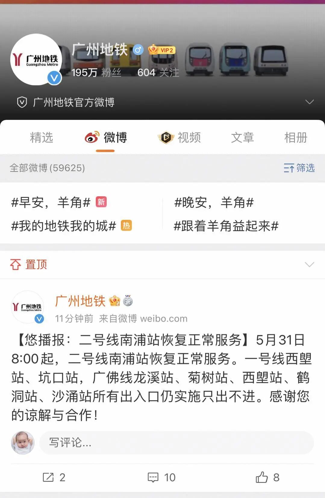 今早(5月31日),广州地铁发布最新消息称:5月31日8:00起,二号线南浦站恢复正常服务。一号线西塱站、坑口站,广佛线龙溪站、菊树站、西塱站、鹤洞站、沙涌站所有出入口仍实施只出不进。