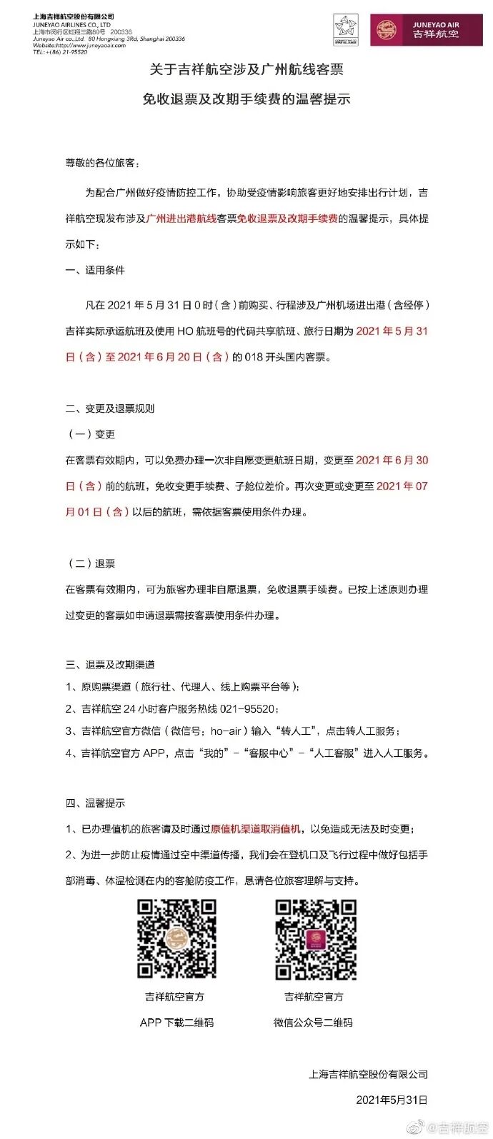 吉祥航空宣布,凡在5月31日0时(含)前购买、形成涉及广州机场进出港(含经停)吉祥实际承运航班HO航班号的代码共享航班、旅行日期为2021年5月31日(含)至2021年6月20日(含)的018国内客票,在客票有效期内,可免费退改签一次,其中改签可变更至6月30日(含)前的航班。