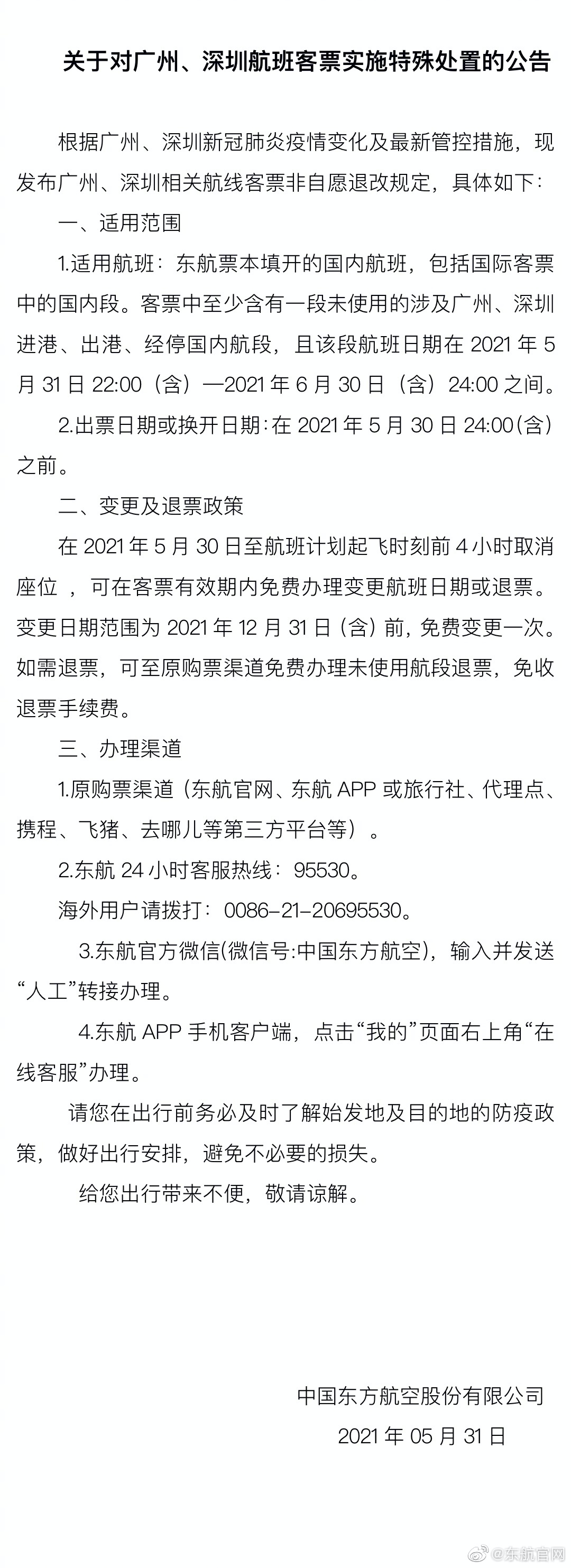 南方航空5月27日在官网公布了涉广州航线退改签政策:自2021年5月27日起,凡在5月27日(含)前购买、行程涉及广州机场进出港(含经停)南航实际承运航班及使用CZ航班号的代码共享航班、旅行日期为5月21日(含)至6月10日(含)的784开头国内客票,自5月22日(含)起,在客票有效期内首次提出改期申请,可免费变更至6月30日(含)前的南航实际承运航班,或免收手续费退票。