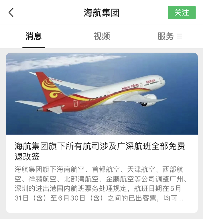 5月30日,海航集团发布通知,即日起,海航旗下所有涉及广州机场和深圳机场的航班全部免费退改签。