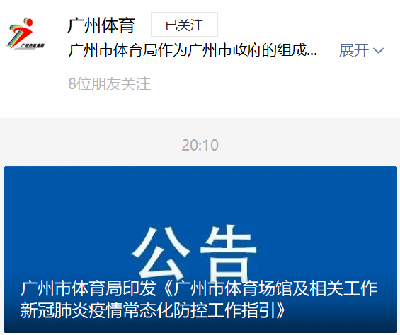 5月30日,广州市体育局根据《广州市新型冠状病毒肺炎疫情防控指挥部关于新冠肺炎疫情分级分类防控工作的通告》(第13号)精神,向各区体育行政部门、局各直属单位、局机关各处室、市体育总会办公室印发了《广州市体育场馆及相关工作新冠肺炎疫情常态化防控工作指引》(以下简称“指引”)。