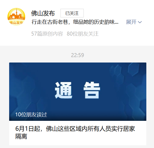 昨晚(5月31日),广东佛山市新型冠状病毒肺炎疫情防控指挥部发布“关于做好新冠肺炎疫情分级分类防控工作的通告”。部分区域实行封闭管理措施,所有人员实行居家隔离。