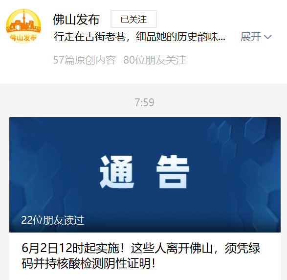 今早(6月1日),广东佛山市新型冠状病毒肺炎疫情防控指挥部发布“关于加强离开佛山人员和车辆管理的通告”。