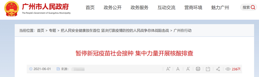 5月31日,广州市副市长黎明会上表示,“鉴于当前我市的疫情防控形势,需要集中精力和资源做好核酸检测,经过综合研判、整体衡量,决定即日(5月31日)起调整新冠疫苗接种工作节奏,近日先有序安排重点行业、重点群体的团体预约和集体接种,暂缓个人预约、暂停新冠疫苗社会接种。”
