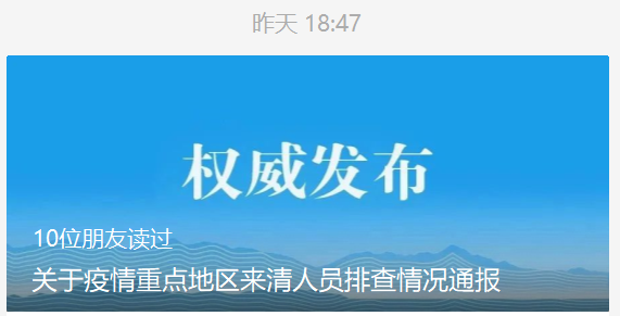 昨天(6月1日)下午18时47分,广东清远市新冠肺炎疫情防控指挥部办公室发布“关于疫情重点地区来清人员排查情况通报”。