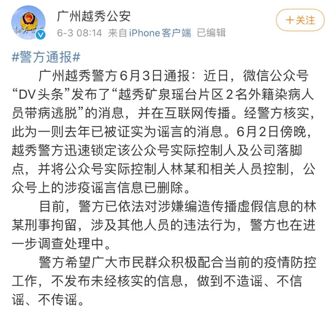 据通报,近日,微信公众号“DV头条”发布了“越秀矿泉瑶台片区2名外籍染病人员带病逃脱”的消息,并在互联网传播。经警方核实,此为一则去年已被证实为谣言的消息。6月2日傍晚,越秀警方迅速锁定该公众号实际控制人及公司落脚点,并将公众号实际控制人林某和相关人员控制,公众号上的涉疫谣言信息已删除。