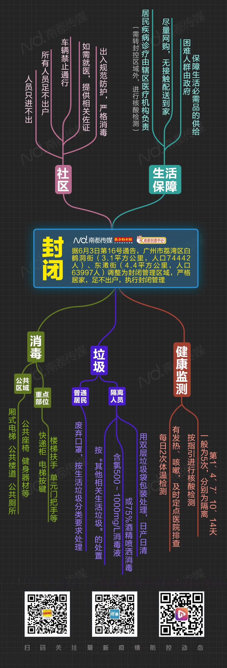 一、将荔湾区白鹤洞街(3.1平方公里,人口74442人)、东漖街(4.4平方公里,人口63997人)调整为封闭管理区域,严格居家,足不出户,执行封闭管理(管理措施按第15号通告附件2执行)。