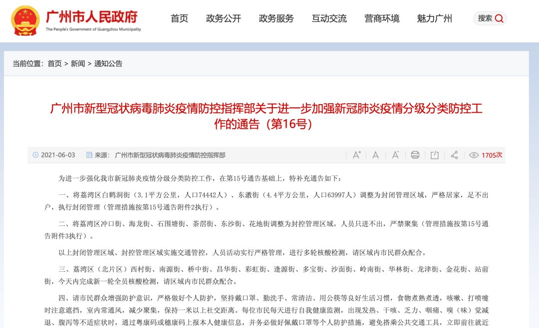 今天(3日)下午4时许,广州市新型冠状病毒肺炎疫情防控指挥部发布《广州市新型冠状病毒肺炎疫情防控指挥部关于进一步加强新冠肺炎疫情分级分类防控工作的通告(第16号)》。