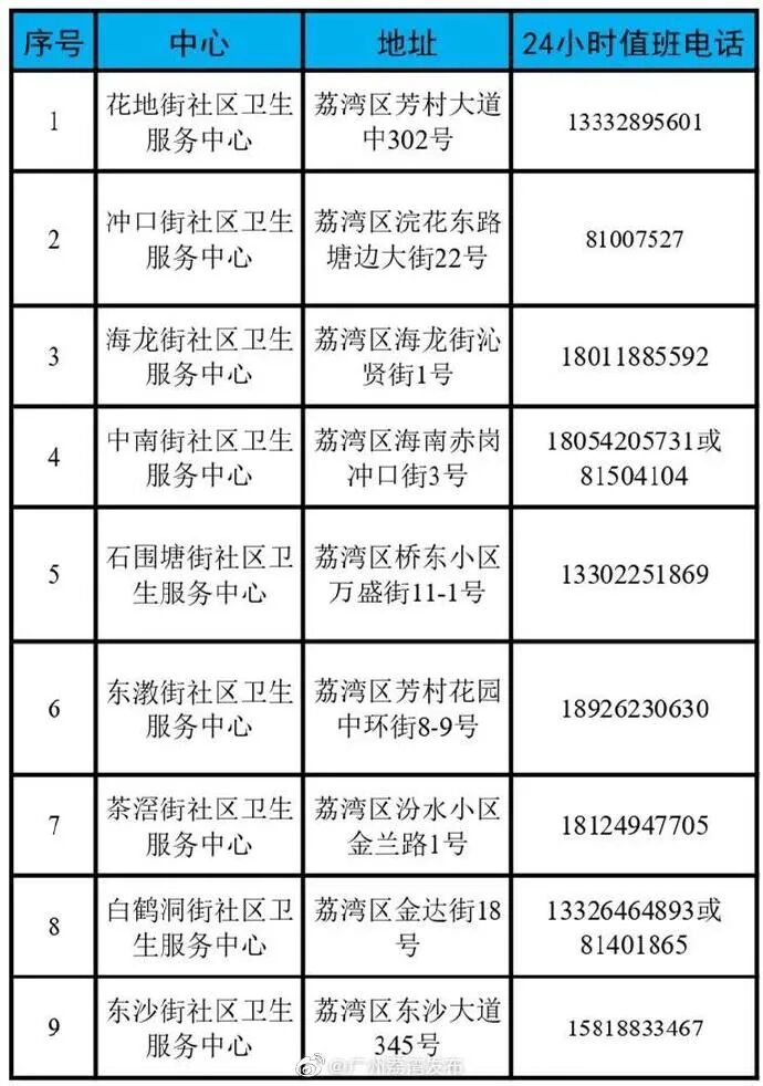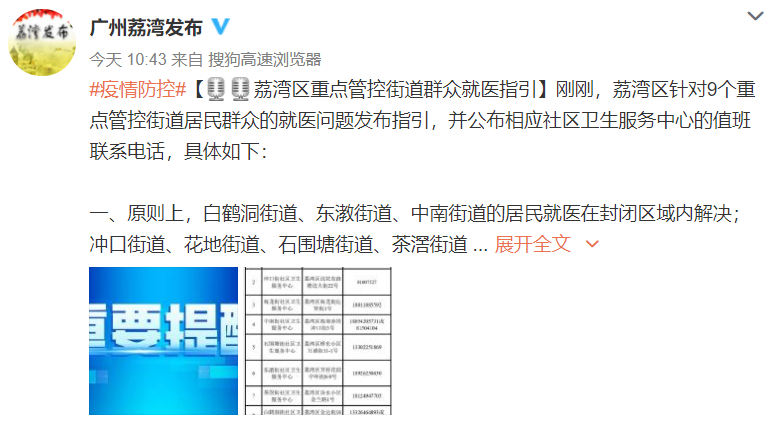 据@广州荔湾发布 今天上午10时许消息,荔湾区针对9个重点管控街道居民群众的就医问题发布指引,并公布相应社区卫生服务中心的值班联系电话。