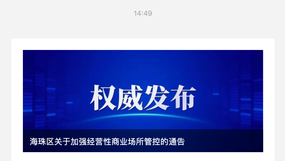 今天下午,广州市海珠区新型冠状病毒肺炎疫情防控指挥部发布《关于加强经营性商业场所管控的通告》,通告称,海珠区全区所有社会餐饮服务单位暂停堂食。
