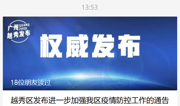 今天下午,广州越秀发布发布《关于落实广州市疫情分级分类防控有关通告精神进一步加强我区疫情防控工作的通告》。
