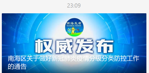 昨天晚上23时许,据南海发布微信公众号发布《南海区关于做好新冠肺炎疫情分级分类防控工作的通告》。