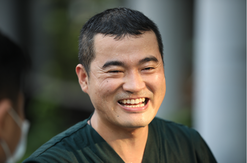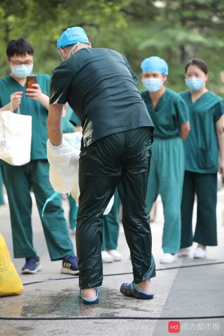 6月3日下午五点半,广州市红十字会医院肾内科主治医师胡建广完成核酸采样任务后脱下防护服,贴身的衣服全湿透,防护服里的汗水哗哗地流下。