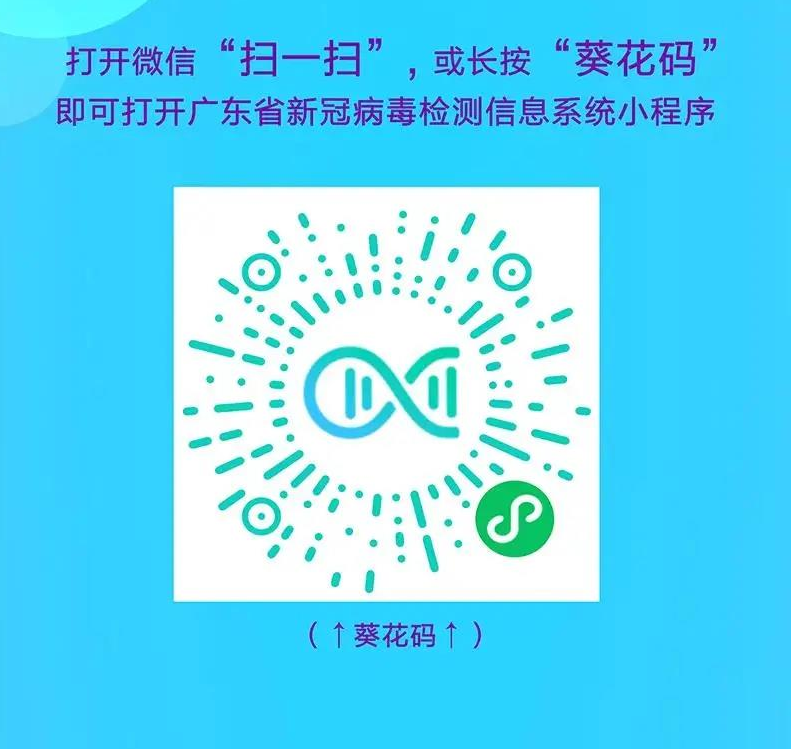 二、为减少等候时间,请市民群众提前通过微信搜索“粤核酸”小程序(或扫描下方“葵花码”),点击“大规模核酸筛查”,录入及保存个人信息,生成“个人采样信息二维码”后截图保存,到采样点后现场出示二维码进行信息读取。