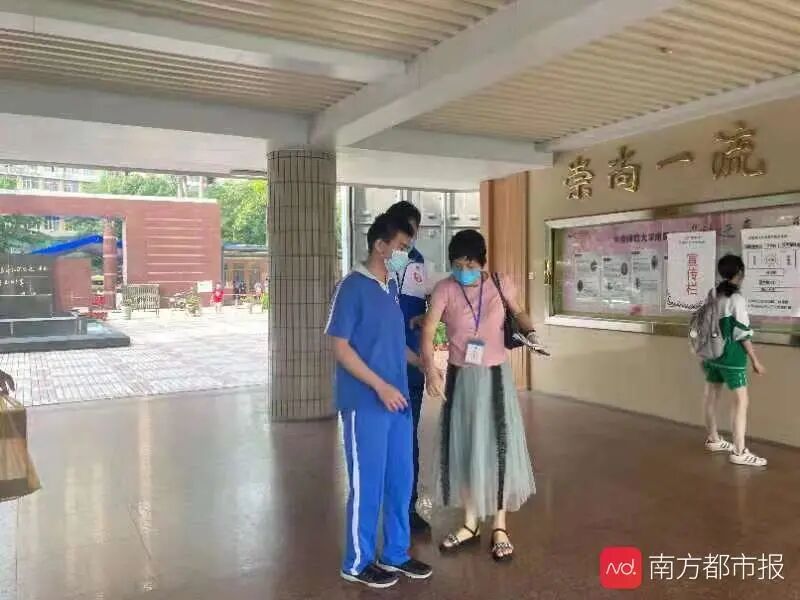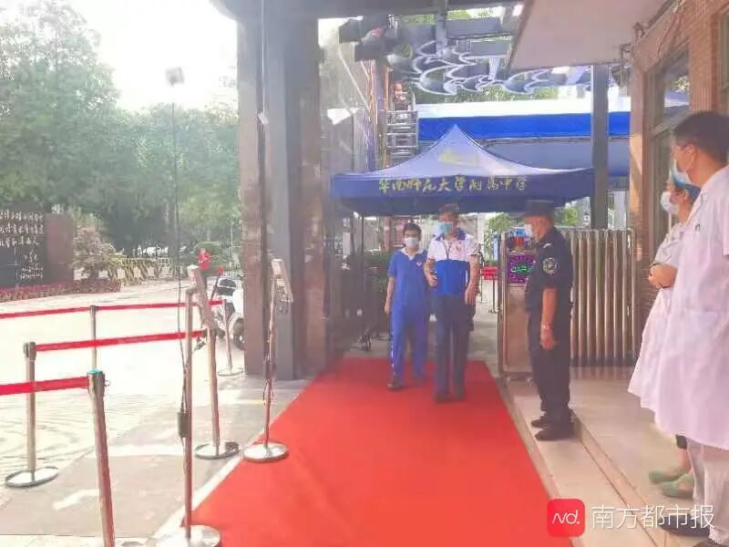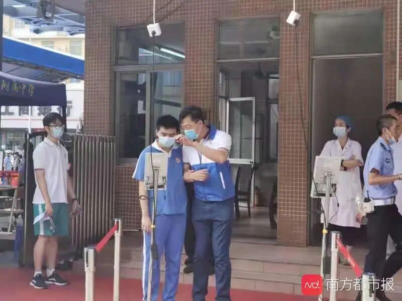 在华南师大附中高考考点门口,他与前来送行的学校老师和家长道别。在工作人员引导下,完成测温、洗手等一系列防疫流程,随后,由专门的考务人员带领至考场。