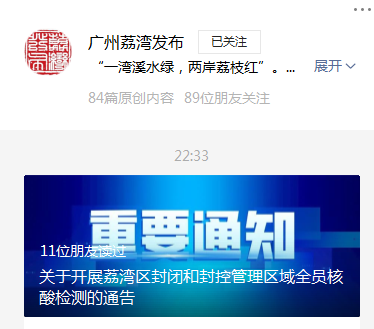 昨日(7日)晚上10时许,“广州荔湾发布”发布了“关于开展荔湾区封闭和封控管理区域全员核酸检测的通告”。据通告,6月8日,荔湾区白鹤洞、中南、海龙、冲口、东漖、茶滘、花地、石围塘、东沙等9条街道辖区内全体居民将进行全员核酸检测。