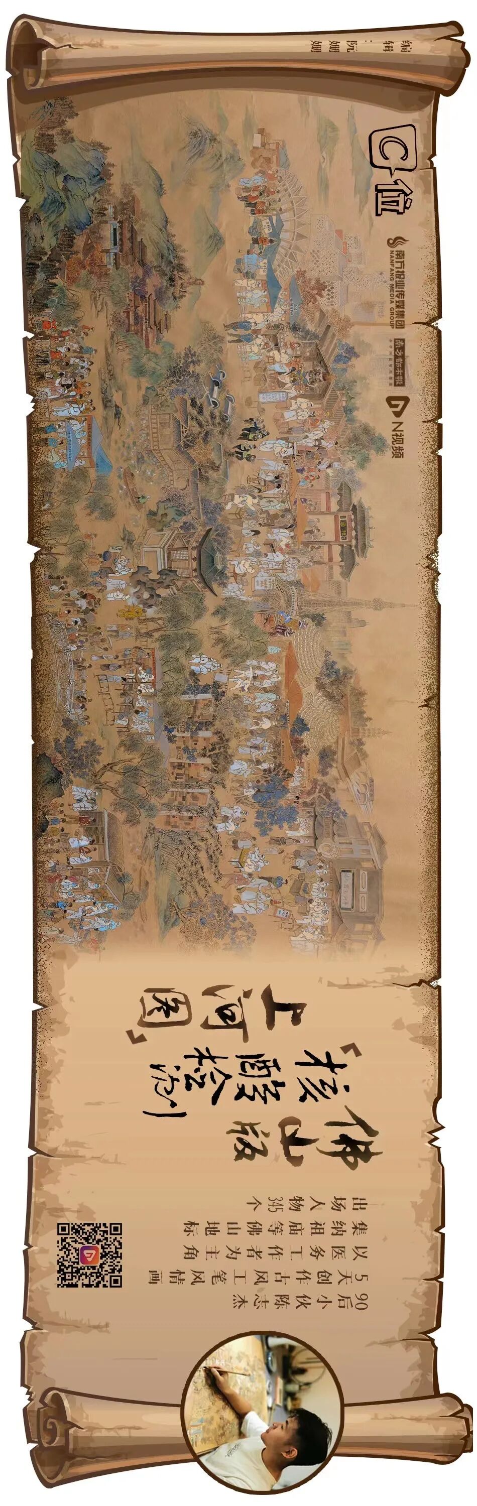 “核酸检测上河图”画作以核酸检测为情景,医务工作者为主角,也展示了集纳了佛山祖庙、岭南明珠体育馆、平洲玉器街、西樵山、佛山西站等15个地标建筑,用蒙太奇的构图方式连接起来。陈志杰说,是被大规模核酸检测的场景所触动,随后花5天时间创作了这幅画。