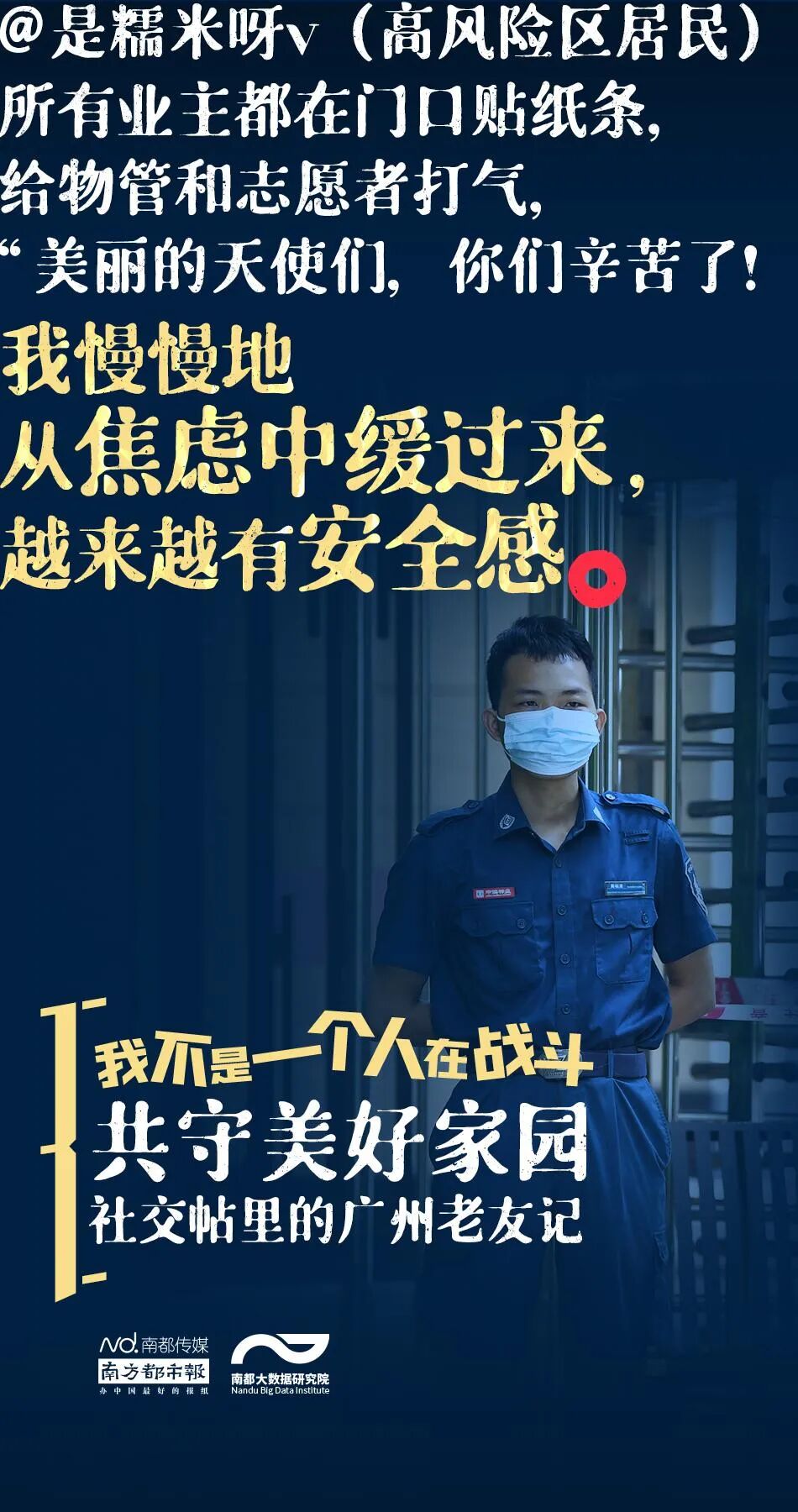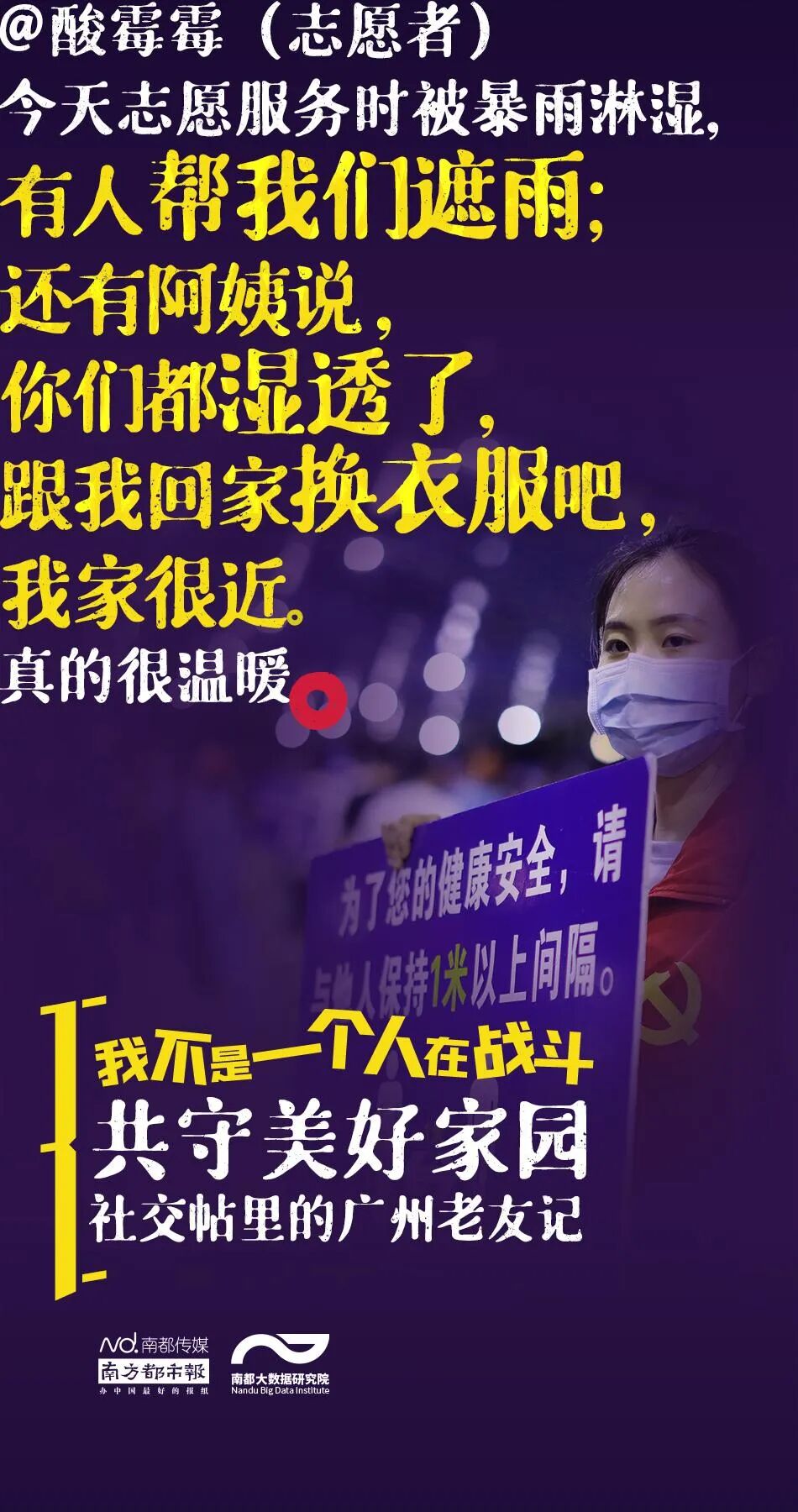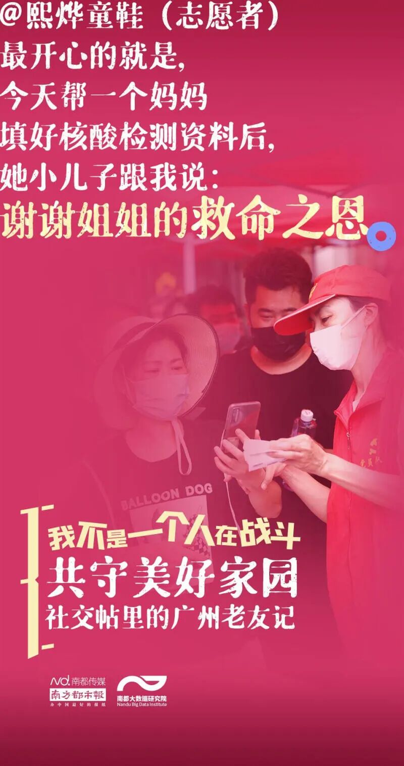 南都大数据研究院从新浪微博、知乎、豆瓣上采集了2021年5月26日以来8000多条广州市民的社交帖子,描摹广州老友记们如何互相鼓劲加油、守护家园——我不是一个人在战斗,我的身后还有你们!
