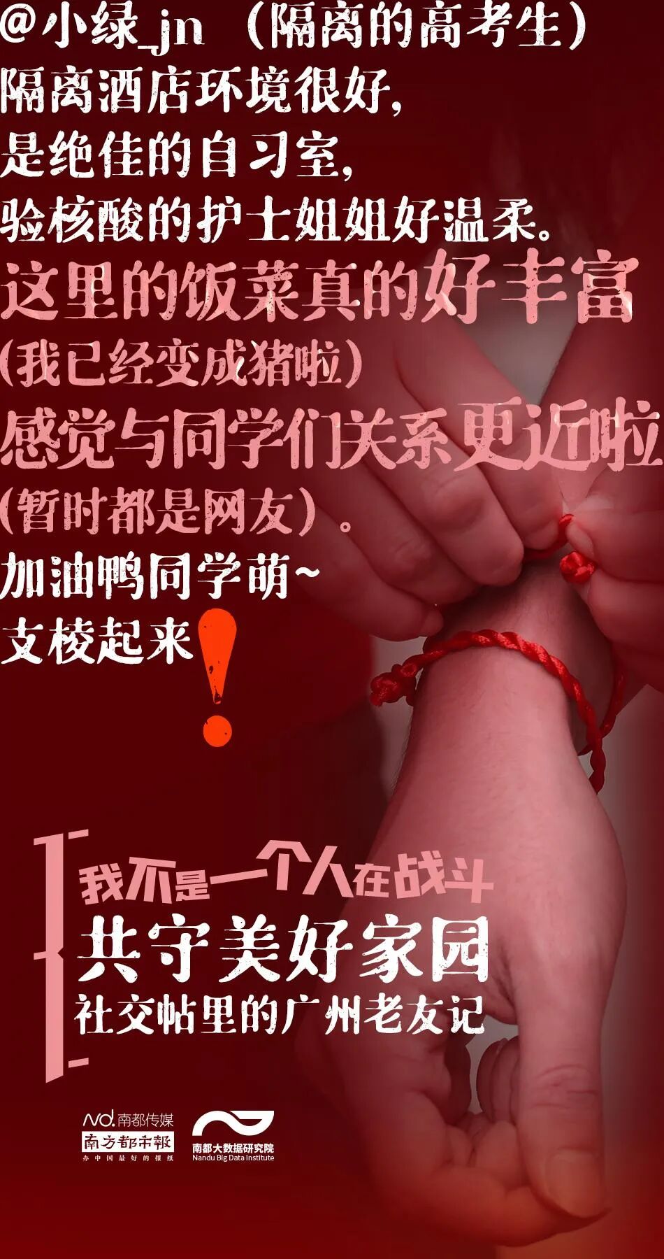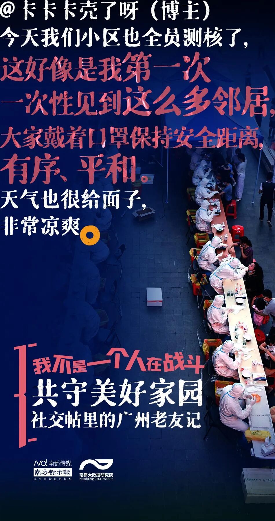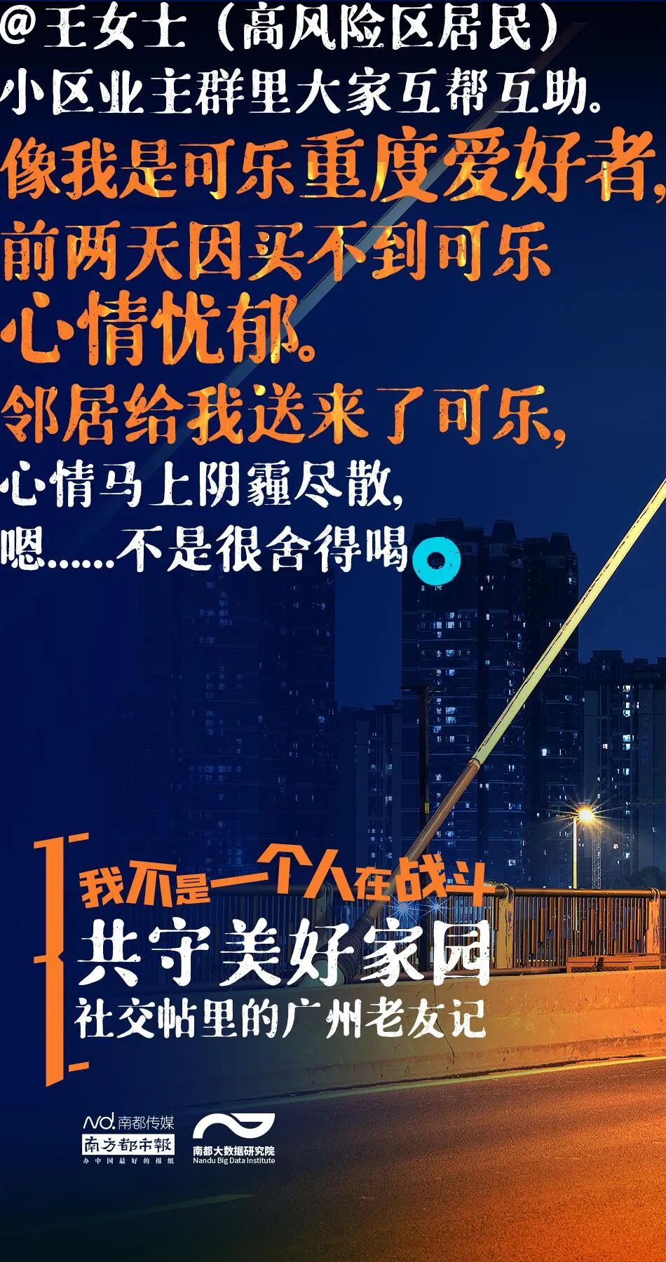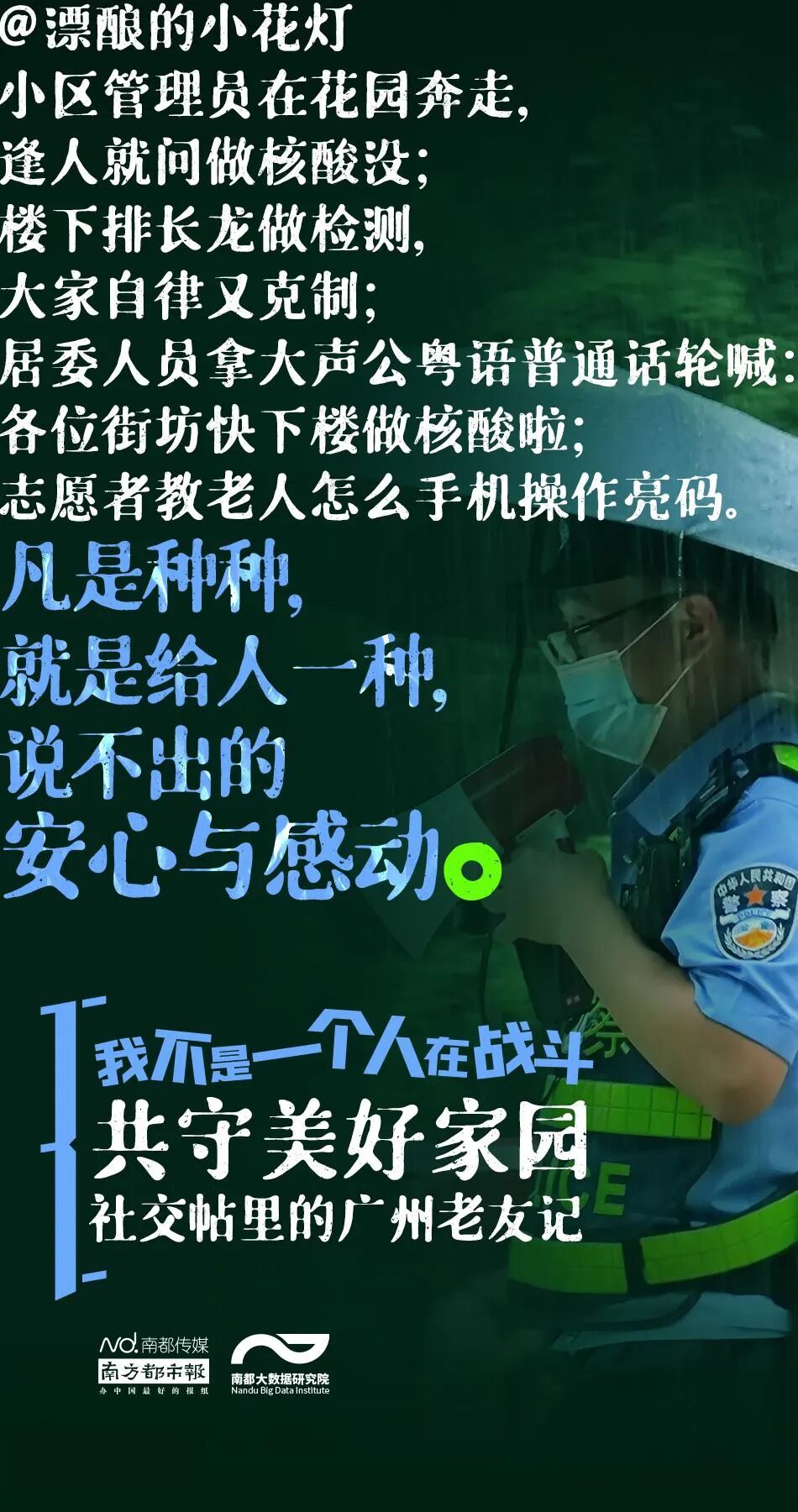 南都大数据研究院从新浪微博、知乎、豆瓣上采集了2021年5月26日以来8000多条广州市民的社交帖子,描摹广州老友记们如何互相鼓劲加油、守护家园——我不是一个人在战斗,我的身后还有你们!