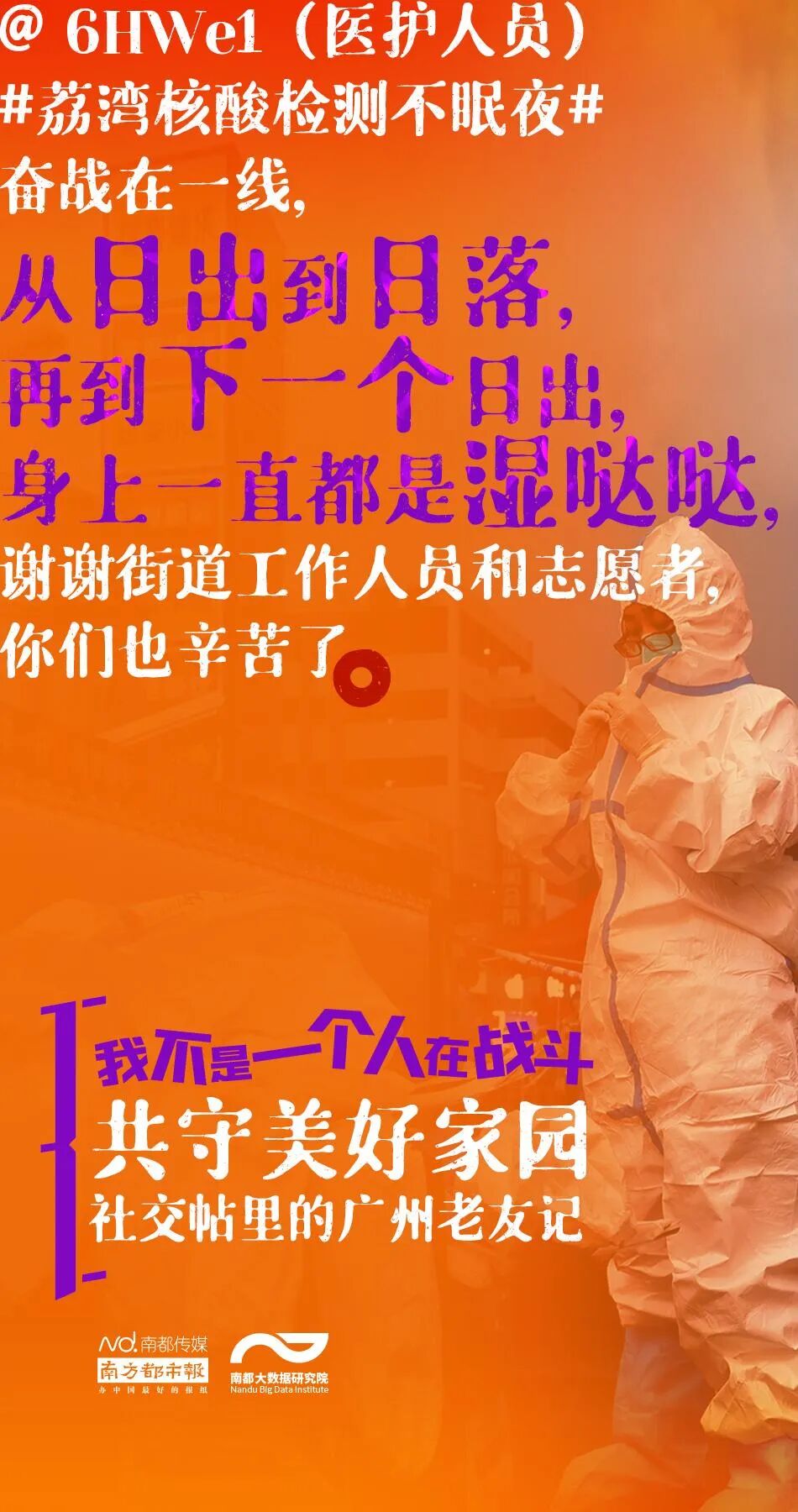 网友@径_Lam 就提到自己第一次当核酸检测志愿者的经历,这也是他第一次亲眼目睹:穿着防护服的医生们在高温下连续工作接近八个小时,而期间只休息了一次,“看到医生防护服里的汗水真的很清晰,很骄傲并且很开心这一次可以以一个志愿者的身份,和他们共同战斗了八个小时!”