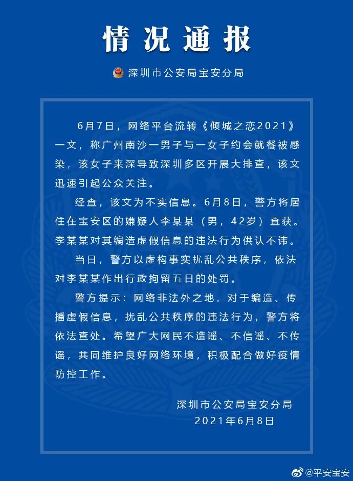 通报称,6月7日,网络平台流传《倾城之恋2021》一文,称广州南沙一男子与一女子约会就餐被感染,该女子来深导致深圳多区开展大排查,该文迅速引起公众关注。经查,该文为不实信息。