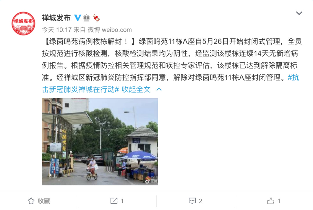 6月9日,据@禅城发布 消息,广东佛山禅城区绿茵鸣苑11栋A座自5月26日开始封闭式管理,全员按规范进行核酸检测,核酸检测结果均为阴性,经监测该楼栋连续14天无新增病例报告。
