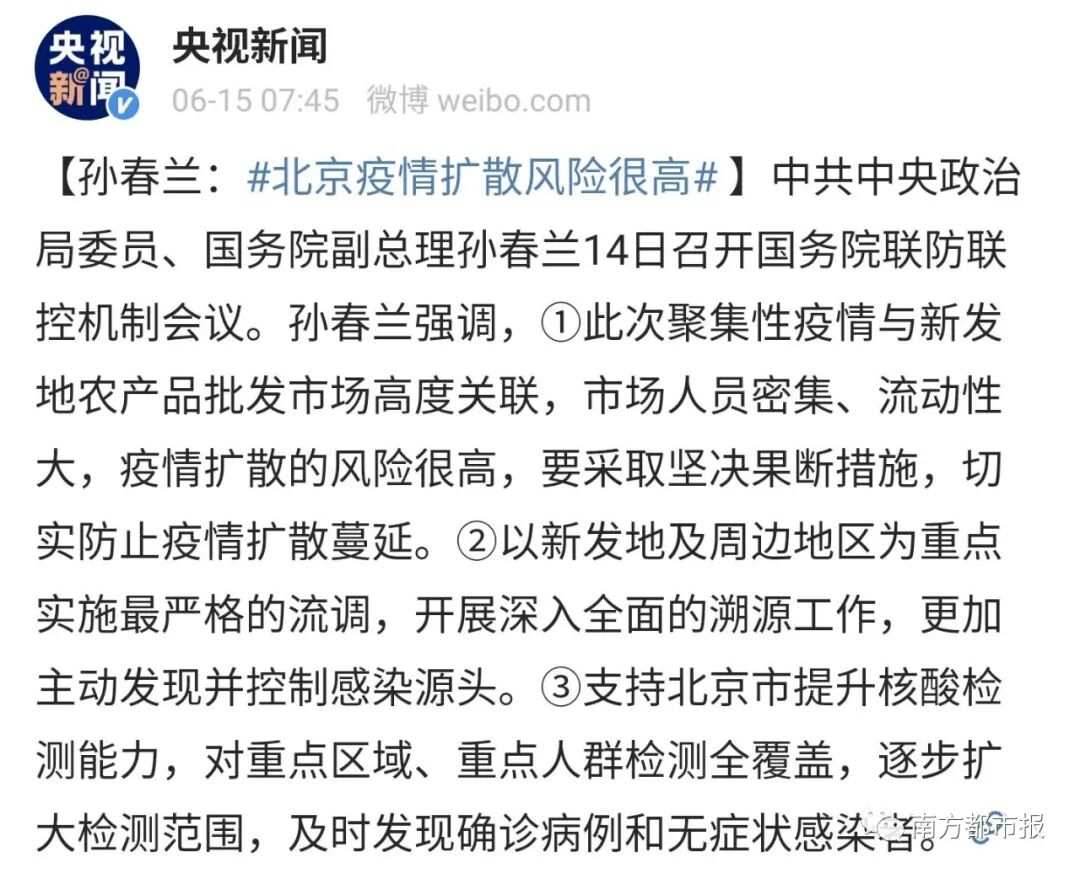 孙春兰强调,此次聚集性疫情与新发地农产品批发市场高度关联,市场人员密集、流动性大,疫情扩散的风险很高,要采取坚决果断措施,切实防止疫情扩散蔓延。以新发地及周边地区为重点实施最严格的流调,开展深入全面的溯源工作,更加主动发现并控制感染源头。支持北京市提升核酸检测能力,对重点区域、重点人群检测全覆盖,逐步扩大检测范围,及时发现确诊病例和无症状感染者。严格社区管控措施,开展拉网排查,对“四类人员”进行集中隔离管理。加强所有医疗机构发热门诊规范设置和改造,严格落实首诊负责制,强化院感防控。深入开展新时代爱国卫生运动,对全国农贸市场、餐饮等场所及物流等环节集中开展消杀,落实环境卫生等防控制度。