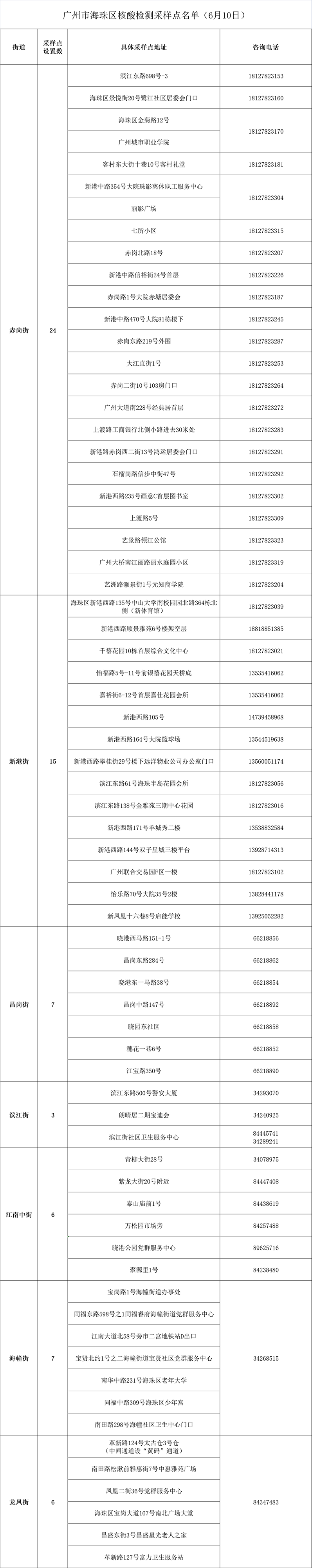为全面落实疫情防控工作,确保居民群众的健康安全,结合防控工作需要,现定于6月10日对赤岗、新港、昌岗、滨江、江南中、海幢、龙凤、沙园、南石头、凤阳、瑞宝、南洲、琶洲共13个街道辖区内全体居民进行全员核酸检测。