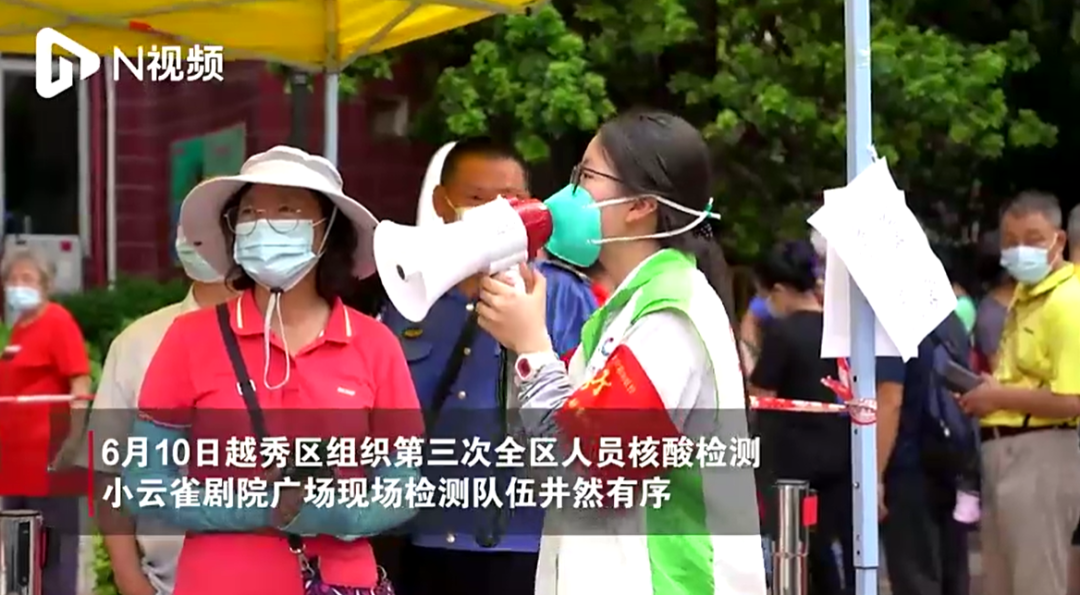 今天(6月10日),广州越秀区组织第三次全区人员核酸检测,小云雀剧院前的检测队伍中有一名身着蓝色校服的学生在指引市民排队检测,她是来自广州市第七中学的应届高考生林天茵。