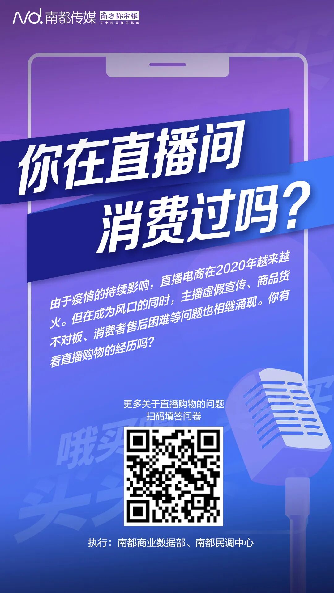 由于疫情的持续影响,直播电商在2020年越来越火。但在成为风口的同时,主播虚假宣传、商品货不对板、消费者售后困难等问题也相继涌现。南都发起问卷调查,了解消费者在直播购物中的体验以及遇到的问题,长按图片识别二维码填问卷,感谢你的积极参与!