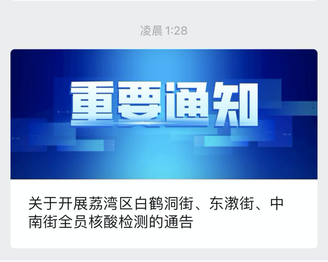 今天(6月12日)凌晨,广州市荔湾区发布通告称,今起将对荔湾区白鹤洞街、东漖街、中南街等3条街道辖区内全体居民进行全员核酸检测。