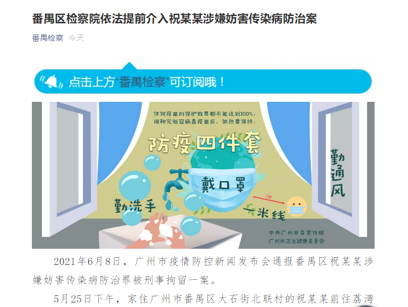 6月8日,广州市疫情防控新闻发布会通报番禺区祝某某涉嫌妨害传染病防治罪被刑事拘留一案。
