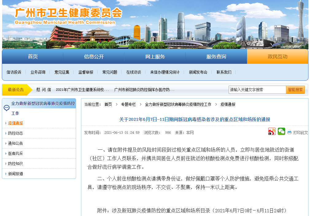 今天(6月13日)凌晨1时24分,广州卫健委官网发布《关于2021年6月7日-11日期间新冠病毒感染者涉及的重点区域和场所的通报》,涉及新冠肺炎疫情防控的重点区域和场所目录共87个。