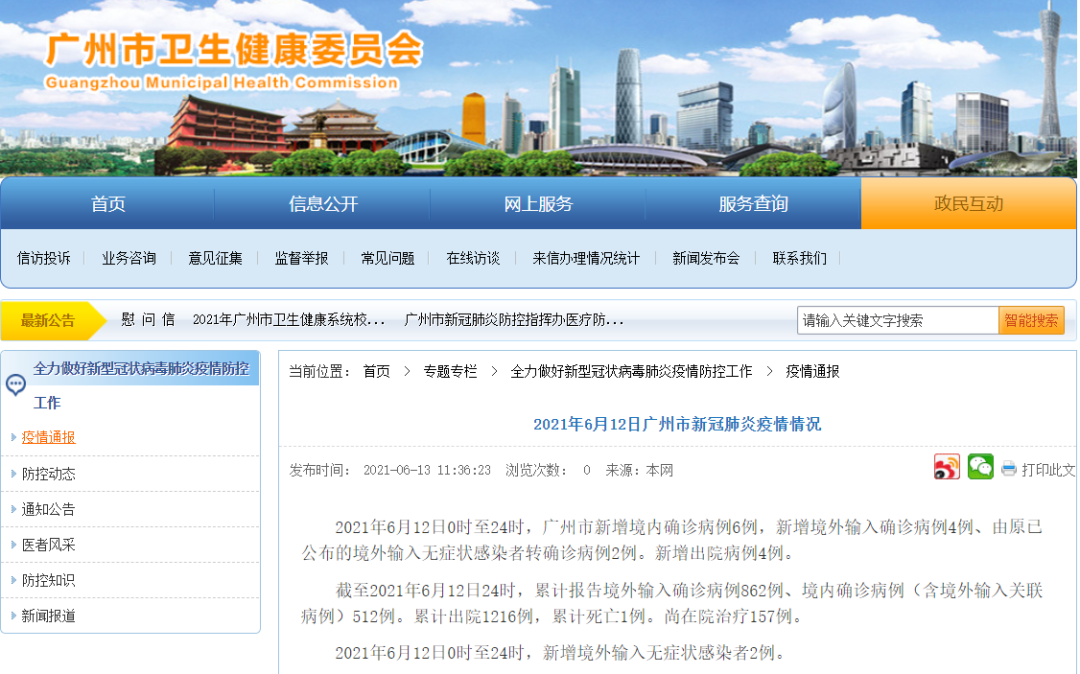 2021年6月12日0时至24时,广州市新增境内确诊病例6例,新增境外输入确诊病例4例、由原已公布的境外输入无症状感染者转确诊病例2例。新增出院病例4例。