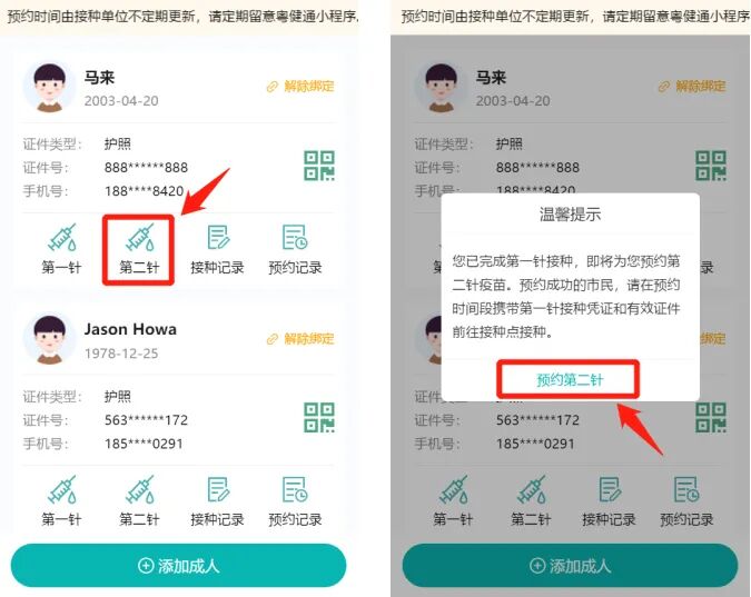 5、找到需要预约第二针疫苗的成人,点击下方的“第二针”,即可开始预约信息填报。